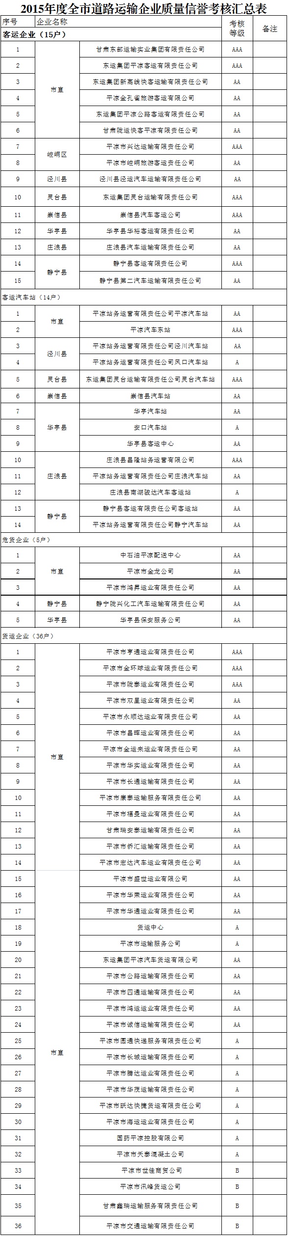 按照省运管局《甘肃省道路运输企业质量信誉考核实施细则》和《甘肃省汽车客运站质量信誉考核实施细则》要求,经过各企业自评,县、市运管局考核,东运集团等70户道路运输企业2015年度质量信誉考核情况初步评定,现予公示并公开征求意见,公示期满后将根据公示意见审定考核结果,并按规定报审。