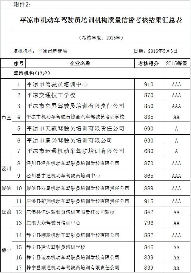 根据交通部《机动车驾驶员培训管理规定》、《机动车驾驶员培训质量信誉考核办法》以及省运管局《甘肃省机动车驾驶员培训质量信誉考核办法》的要求,现对2015年度全市机动车驾驶员培训机构质量信誉考核结果予以公示,广泛接受社会监督。公示时间: 2016年5月3日至 2016年5月10日。如有不同意见请于公示期内以书面形式将情况反映至38365-365.com(地址:平凉市南环中路59号,邮编:744000,电话:8228176)。